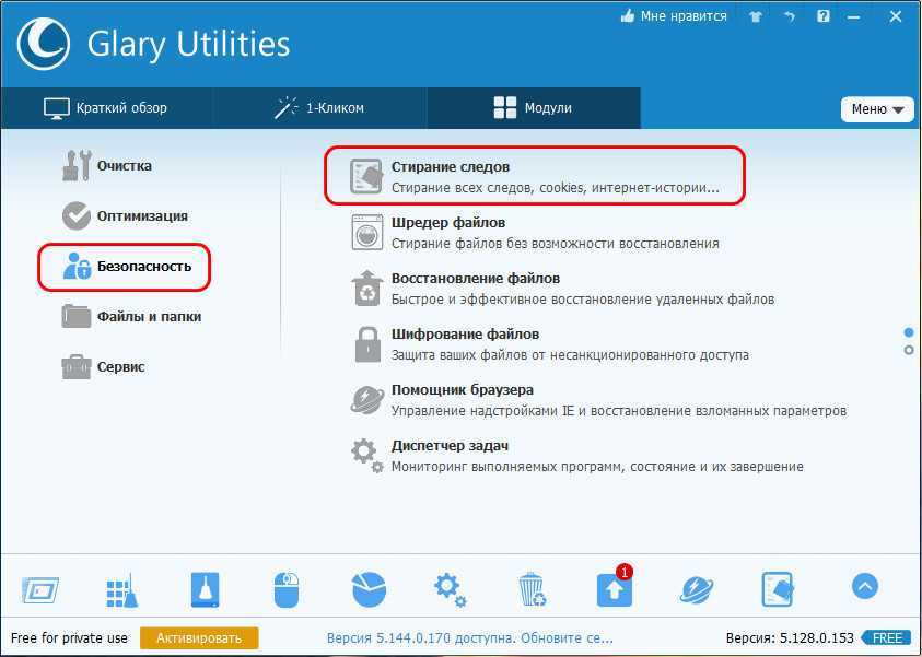 В разделе программы «Безопасность» запускаем «Стирание следов».