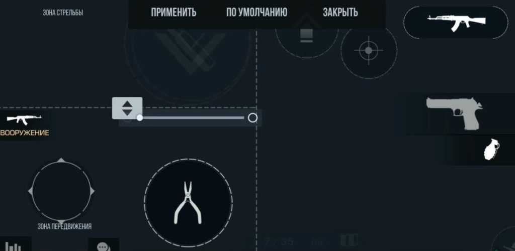 - В процессе кастомизации увеличиваем кнопку приседа (50% от максимального размера) и располагаем ее вверху слева от центральной горизонтали экрана вместе с кнопкой стрельбы.