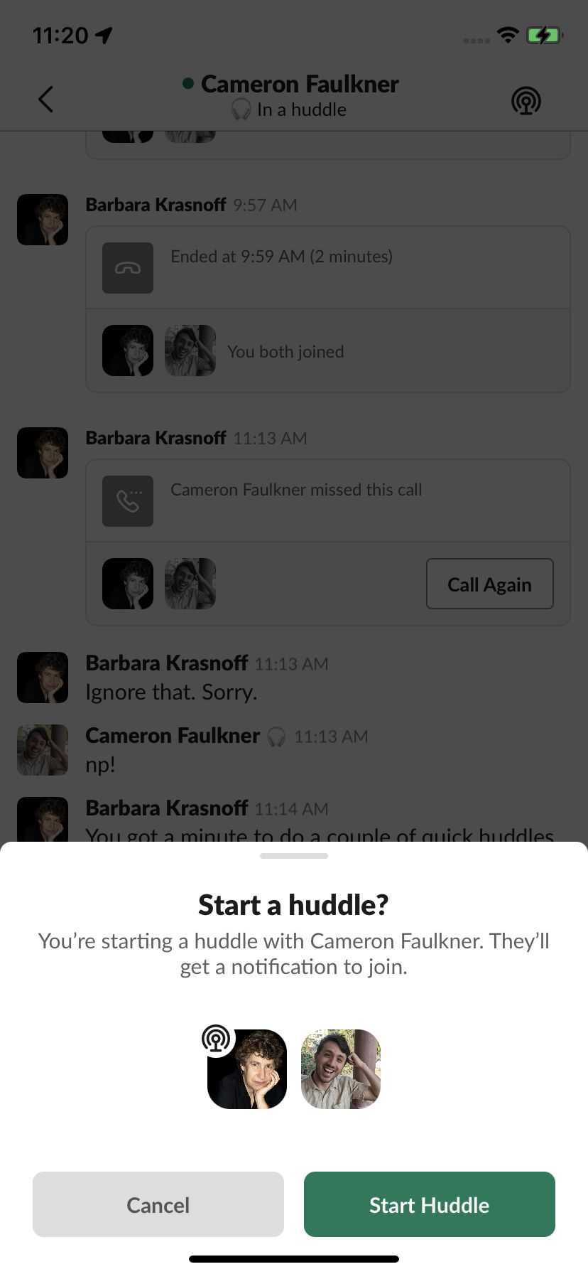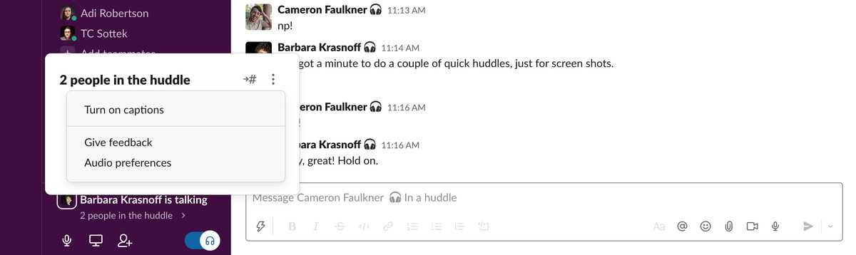 Прошлой весной Slack представил Huddles, которые предназначены для аудиоразговоров, к которым вы можете сразу же подключиться во время текстового разговора с одним или несколькими людьми (в отличие от аудиовызовов, которые немного более формальны). К сожалению, они доступны только при наличии платного аккаунта.
