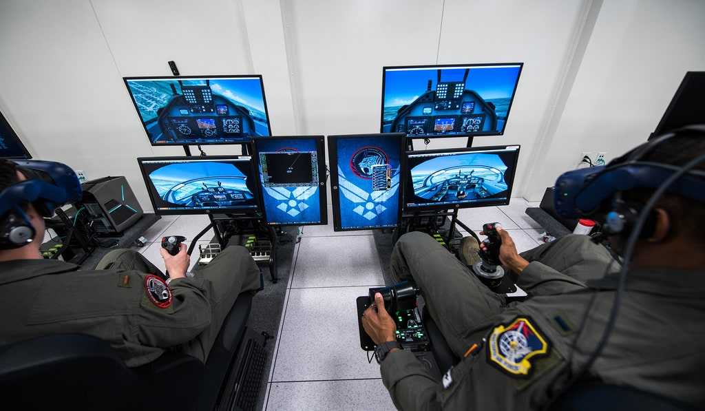 Ещё одной областью применения смешанной реальности можно назвать симуляторы для обучения. Самым распространённым видом использования симуляционного обучения является тренировка пилотов гражданской и боевой авиации на специальных тренажёрах. Сам тренажёр представляет собой полную копию кабины самолёта, но вместо стекла в нём дисплеи, отображающие виртуальную картину за бортом. Иногда такие тренажёры могут вращаться в нескольких плоскостях, в зависимости от действий обучающегося и моделируемой ситуации. Подобные тренажёры создаются не только для авиационной, но и для других видов техники.