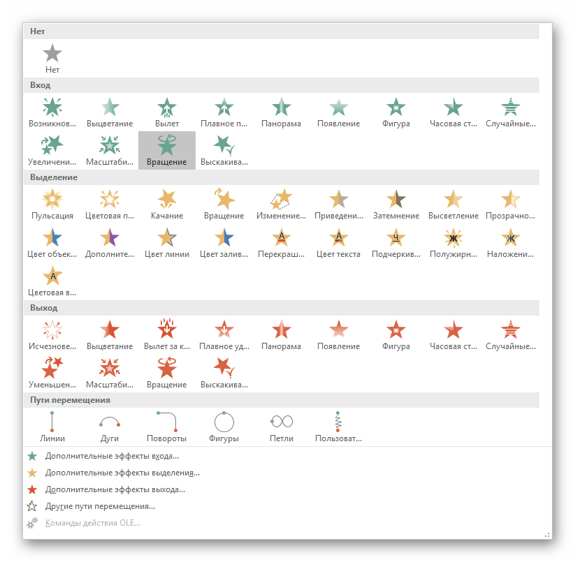 К счастью, Microsoft несколько облегчает эту работу за счет разделения стилей анимации на три типа — Вход, Акцент и Выход.