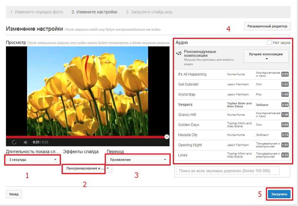 При настройке слайд-шоу мы сразу попадаем в простой редактор. Для доступа к более продвинутым функциям настройки нашего видео нужно нажать Расширенный редактор и во всплывающем окошке нажать Покинуть эту страницу