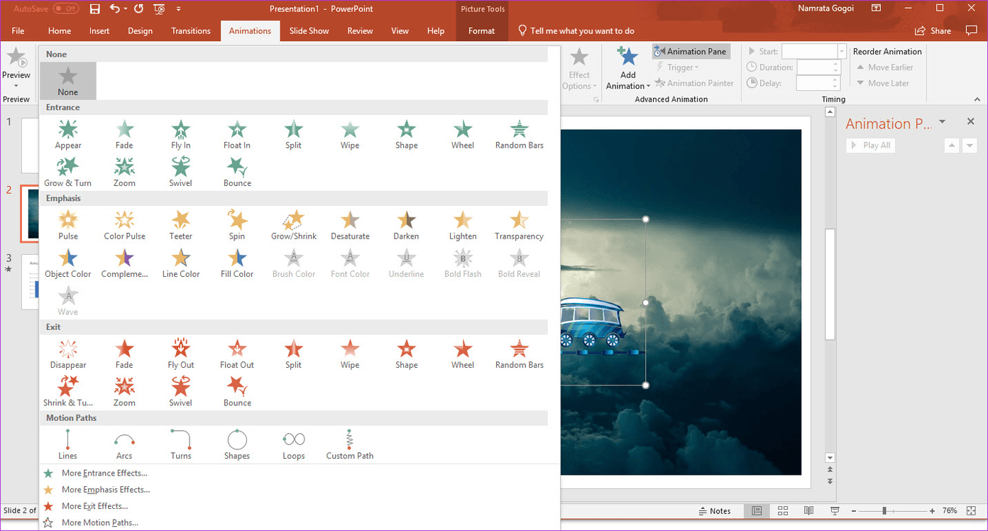 Чтобы проверить типы анимации, выберите элемент, который вы хотите анимировать, и нажмите на вкладку Анимация в верхней части. Затем нажмите на маленький значок стрелки вниз, как показано на скриншоте ниже, чтобы увидеть все стили.