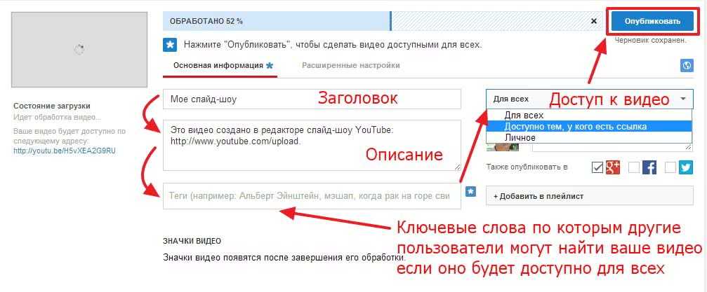 Осталось только задать название, описание, теги (ключевые слова по которым другие пользователи могут найти ваше видео если она с доступом для всех), уровень доступа и нажать Опубликовать