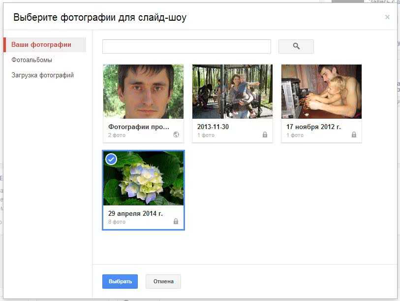 Чтобы загрузить фото переходим в раздел Загрузка фотографий. Загружаем и возвращается в раздел Ваши фотографии. Выбираем фото для слайд-шоу и жмем Выбрать