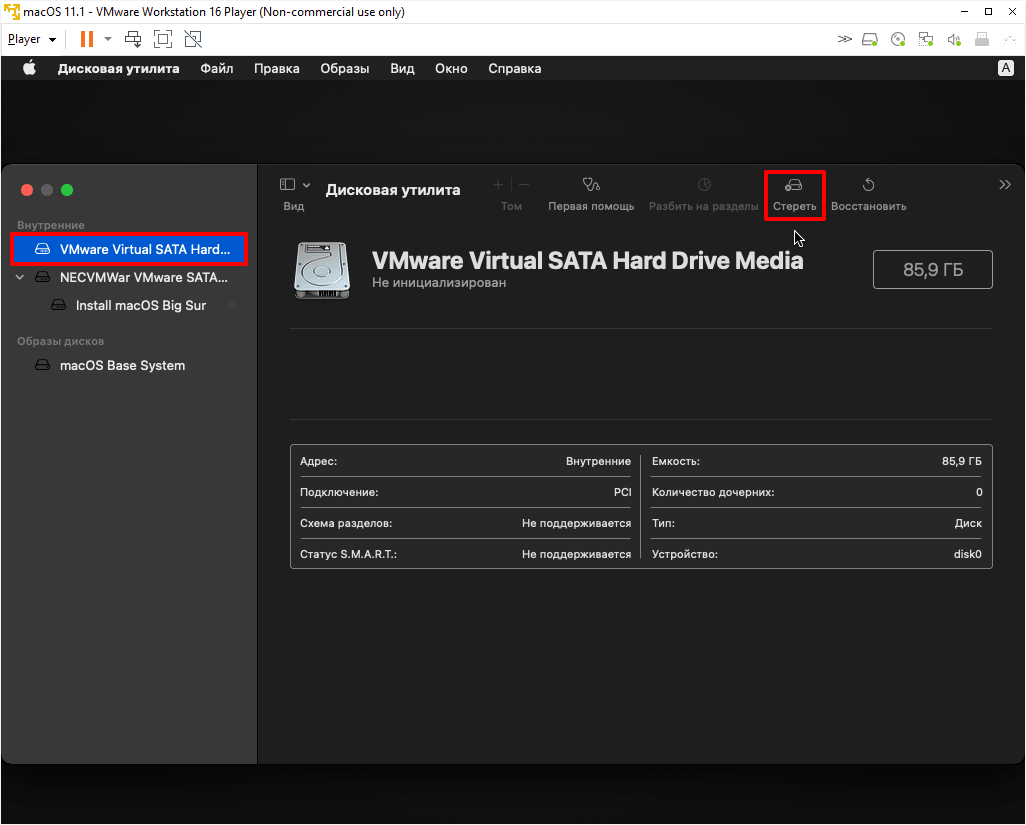 Выберите виртуальный жёсткий диск VMware Virtual SATA Hard Drive Media и нажмите Стереть: