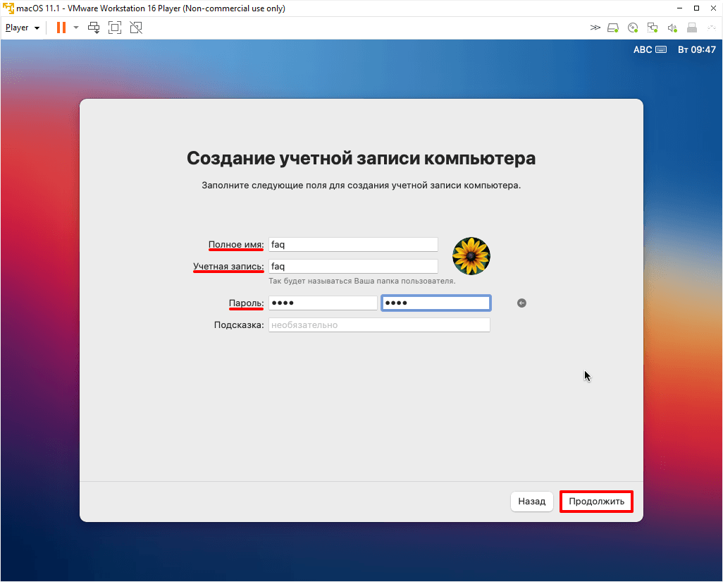 Заполните поля, задайте пароль и нажмите Продолжить:
