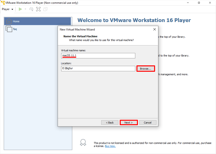 Если вы хотите оставить название и директорию по умолчанию, нажмите Next. Если вы хотите изменить их, в поле «Virtual machine name» введите имя новой виртуальной машины. Затем нажмите Browse, чтобы выбрать папку, в которой будет храниться виртуальная машина. После этого нажмите Next: