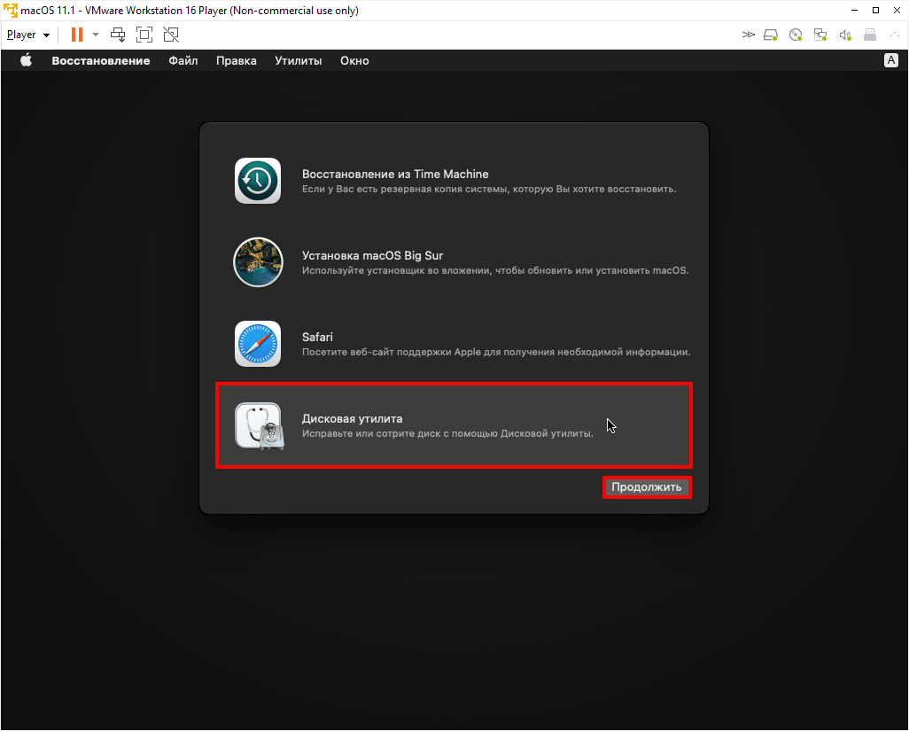 Отформатируйте виртуальный диск. Для этого выберите Дисковая утилита и нажмите Продолжить: