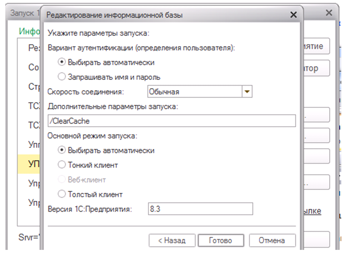 И тот и другой параметр можно задать в строке « Дополнительные» с помощью меню настроек в момент корректировки инфобазы. Когда запустится программа, отобразиться такое окно:
