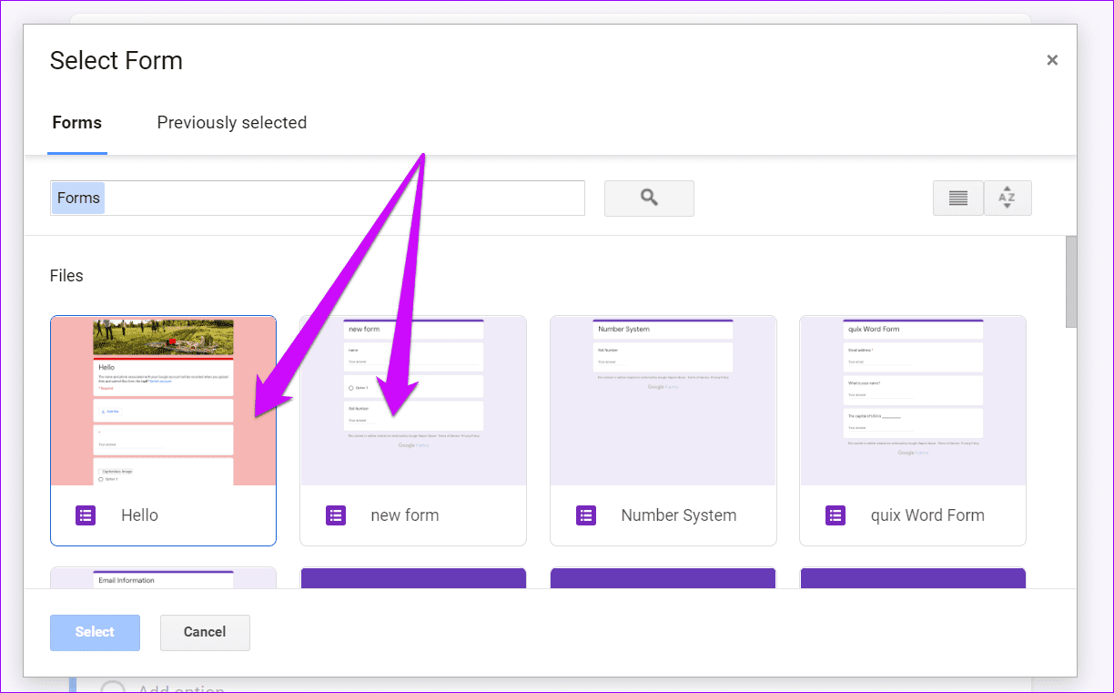 Google Forms remembers the previous form selections and that’s clever. So, if you happen to pick a single from, you can find it right under the Previously Selected tab.
