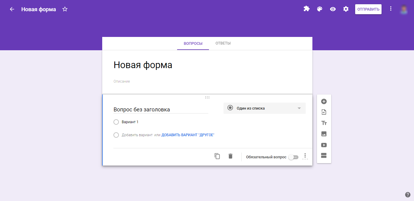 Добавляйте в анкету столько вопросов, сколько Вам необходимо. Когда она будет готова, можно будет нажать на кнопку «Отправить» в верхней части экрана справа.
