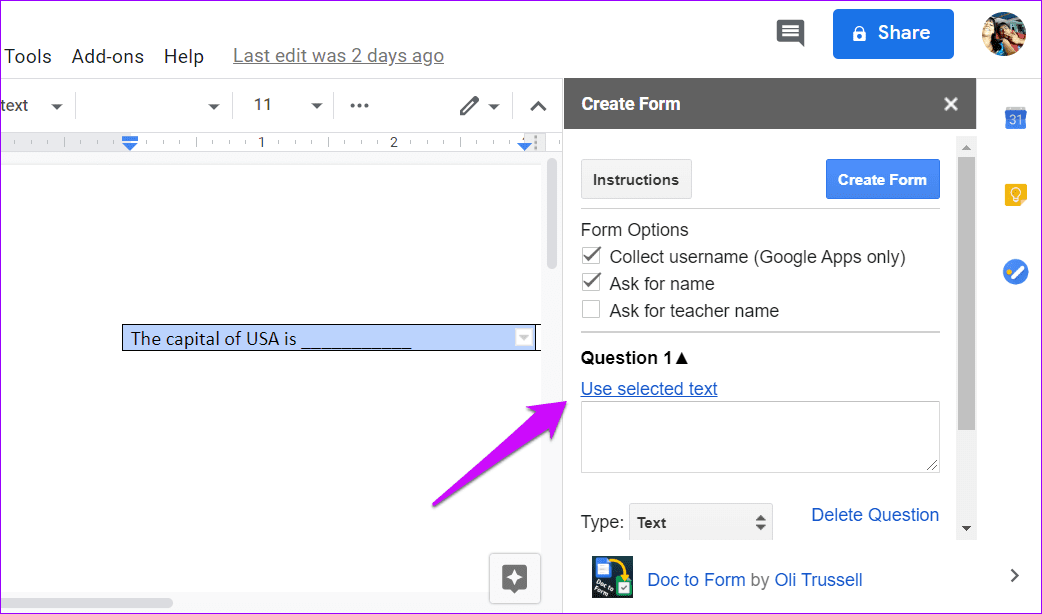 Step 2: After that, click on the Add-on button and select Doc to From > Create Form from Doc. Since this add-on is designed primarily for school teachers, you will see the option to add the name and teacher name on the form.