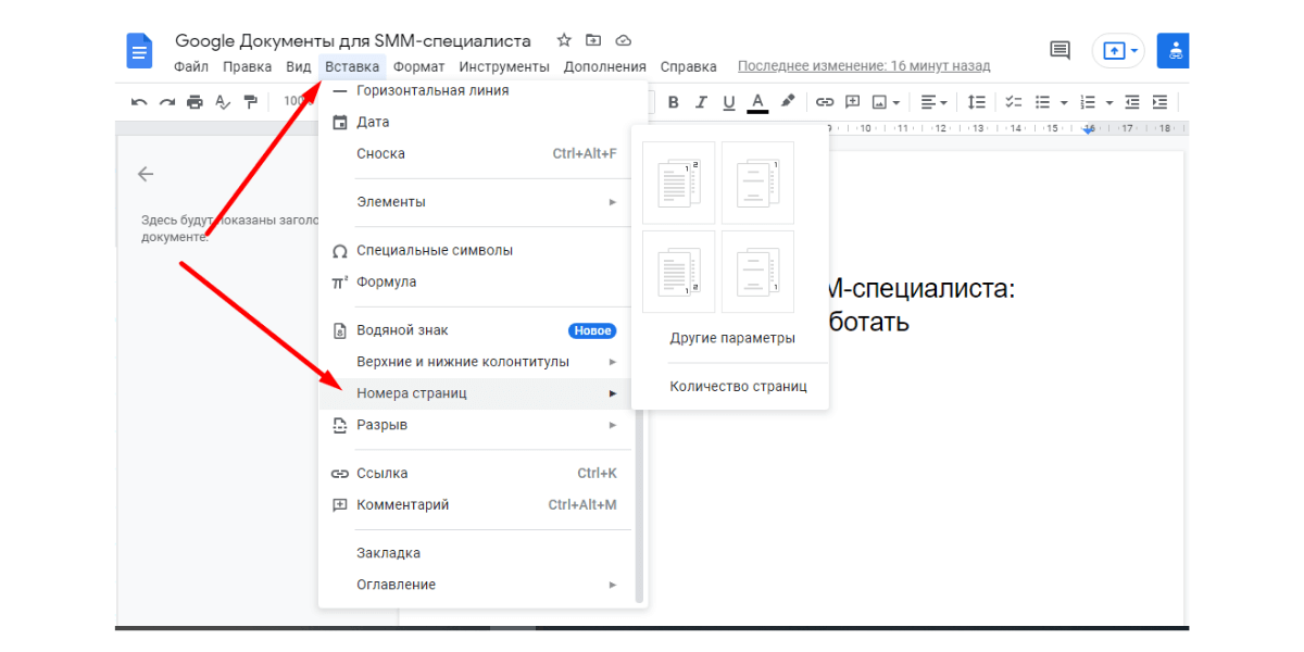 Если вам нужно пронумеровать страницы в документе, откройте меню «Вставка» и нажмите «Номера страниц».