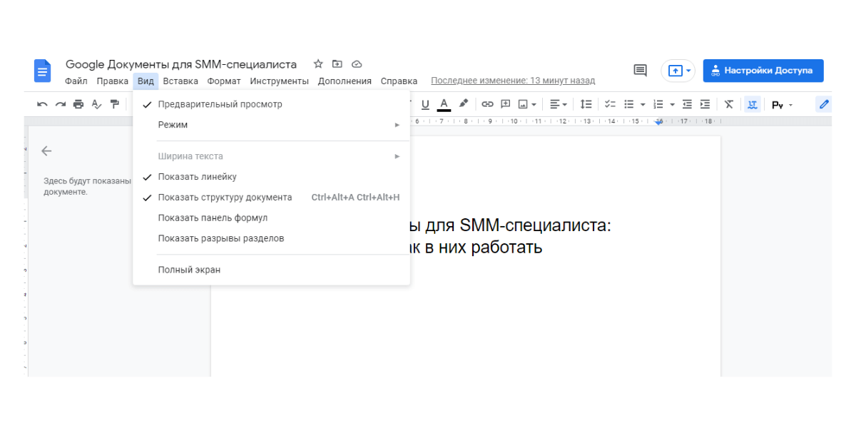 Если вы хотите посмотреть структуру документа Гугл Докс, быстрее найти нужный блок текста, добавить линейку для разметки, изменить режим пользования документом, воспользуйтесь меню «Вид».