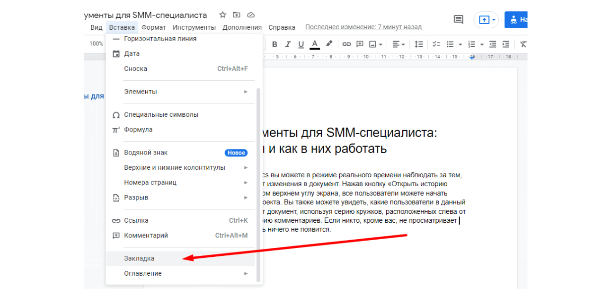 Добавляем закладки в документ через меню «Вставка», как показано на картинке.