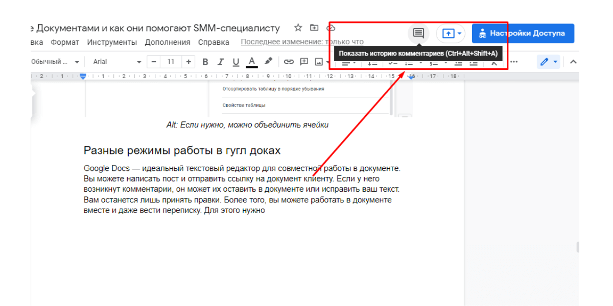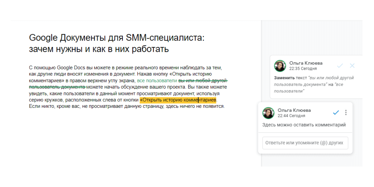 Google Docs – идеальный текстовый редактор для совместной работы в документе. Вы можете написать пост и отправить ссылку на документ клиенту. Если у него возникнут комментарии, он может их оставить в файле или исправить ваш текст. Вам останется лишь принять правки. Более того, вы можете работать в документе вместе и обсуждать работу. Для этого нужно нажать кнопку «Показать историю комментариев» в правом верхнем углу экрана.