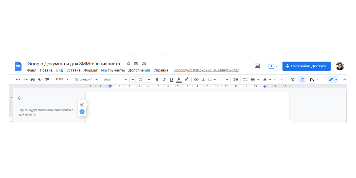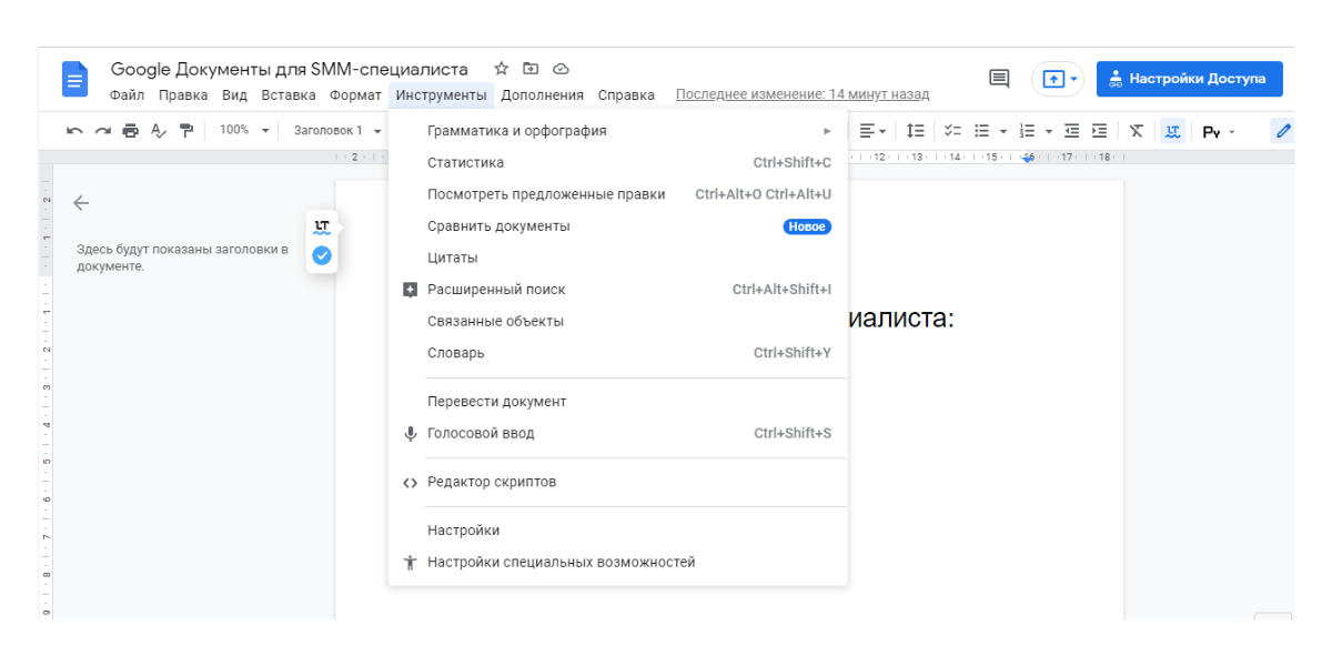 Очень полезная для SMM-щика вкладка. С ее помощью удобно проверить текст на ошибки, быстро подсчитать количество символов и слов, перевести текст на другой язык, воспользоваться словарем для проверки слов или подбора синонимов. Если вы не любите набирать текст, воспользуйтесь функцией «Голосовой ввод».