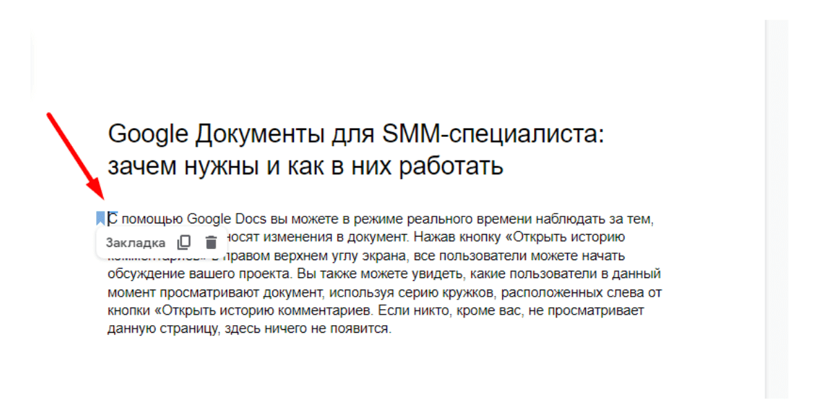 Закладки – это ссылки, с помощью которых легко ориентироваться в многостраничном документе. Вы можете создать закладку, например, на 28 странице документа, скопировать ее ссылку и отправить другому пользователю. При переходе по этой ссылке человеку откроется сразу 28 страница с нужным блоком текста. Это очень удобно, если нужно быстро открыть конкретную страницу.