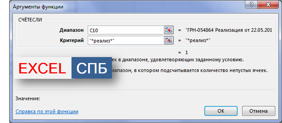 Аргумент «Диапазон» – это соответствующая ячейка с наименованием документа.
