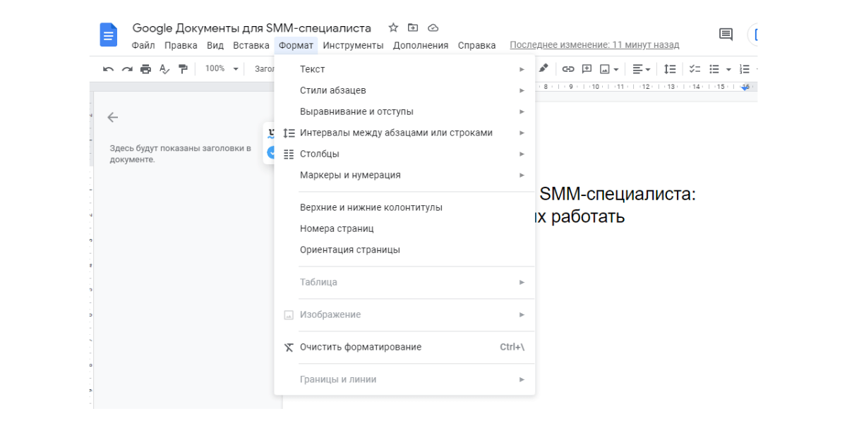 Во вкладке меню «Формат» находятся все инструменты для форматирования текста