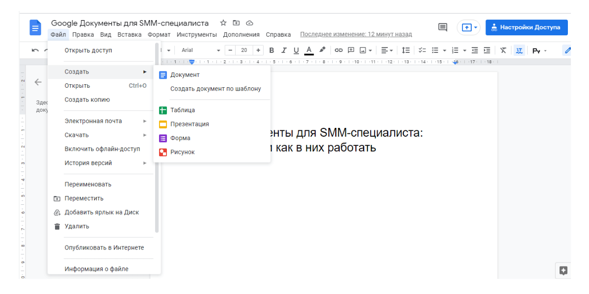 Здесь можно открыть доступ к документу другим пользователям, создать новый файл Google: документ, таблицу, презентацию, форму, график, рисунок. В этом же меню есть возможность открыть файлы Word и PDF в Гугл Докс, создать копию открытого документа, отправить файл по электронной почте, включить офлайн-доступ, скачать документ, распечатать, переместить в другую папку, удалить и прочее.