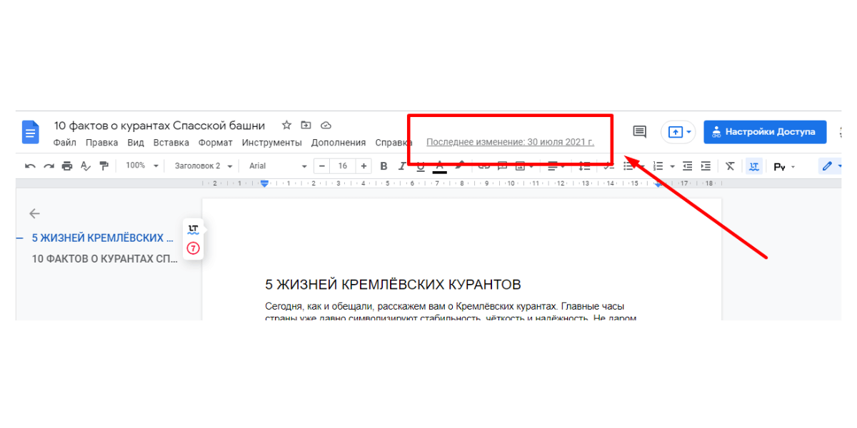 Все изменения, которые когда-либо вносились в документ, сохраняются в истории версий. При необходимости вы всегда можете просмотреть и восстановить предыдущие версии. Для этого найдите на панели инструментов «Последние изменения» и нажмите их.