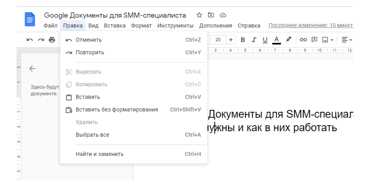 Если в процессе работы вам нужно отменить, копировать и повторить написанный текст, воспользуйтесь меню «Правка». Здесь же есть подсказка, какими горячими клавишами можно ускорить работу.