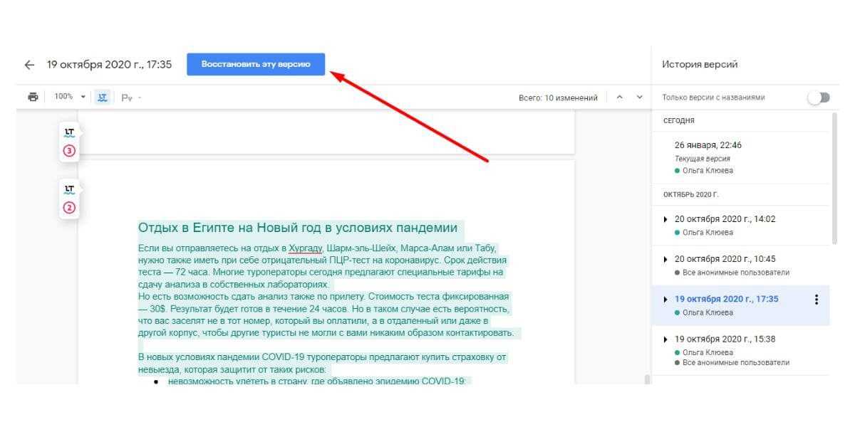 В новом открывшемся окне справа будет история версий с датами и временем. Также можно увидеть, кто вносил правки. Чтобы посмотреть нужную версию документа, нажмите справа на выбранную дату. Если вы хотите восстановить эту версию, нажмите синюю кнопку «Восстановить эту версию».
