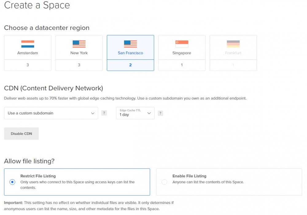 On this instance, we’re selecting to create the house in Datacenter Area 2, San Francisco, allow the CDN (with out a customized subdomain), and prohibit the nameless file itemizing.