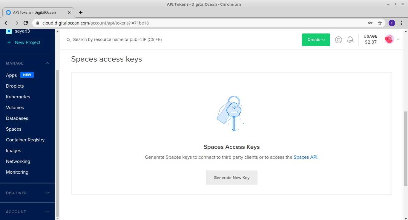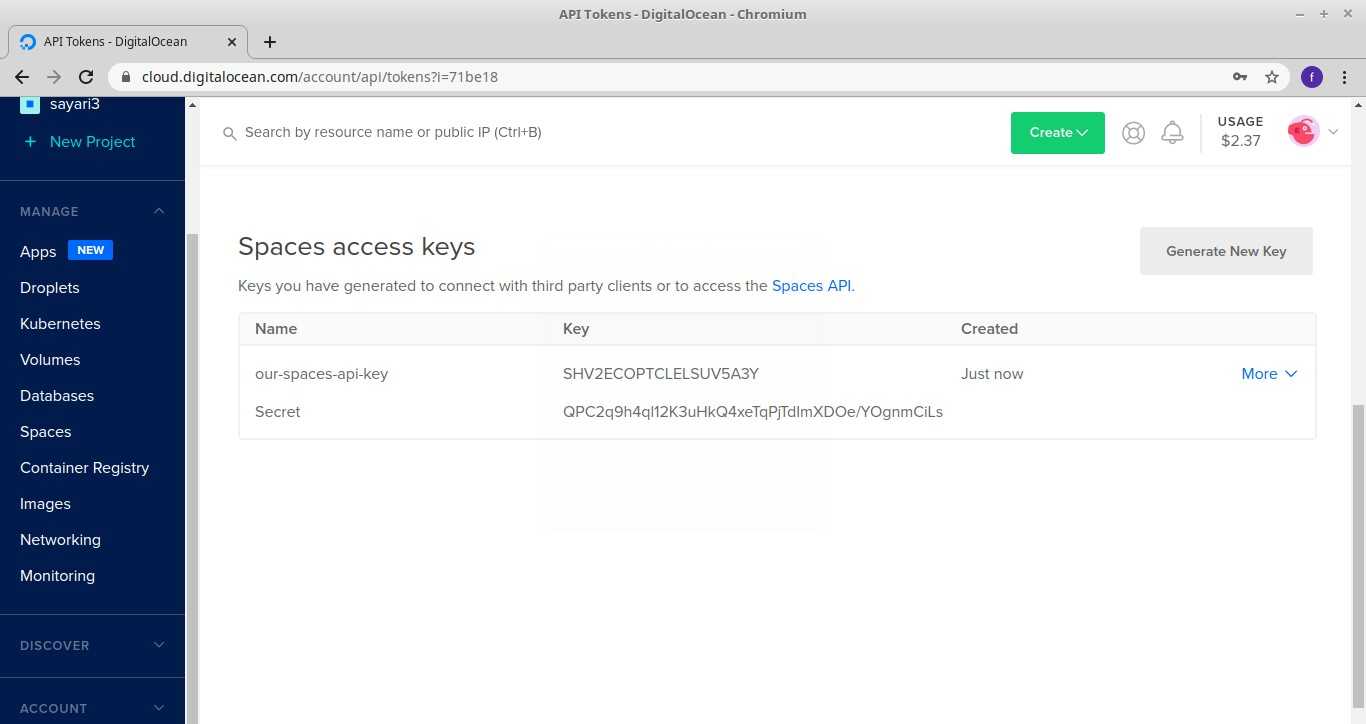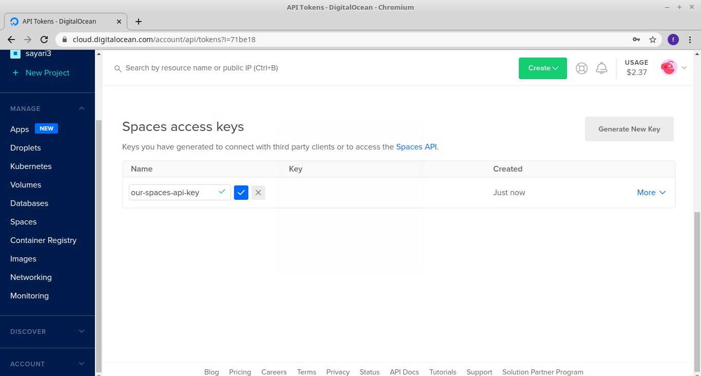OK, so now we have our Spaces Access Key + Secret as well as our DigitalOcean API key. We can now move on to actually creating some droplets, a bucket, and share files across the two using s3fs.