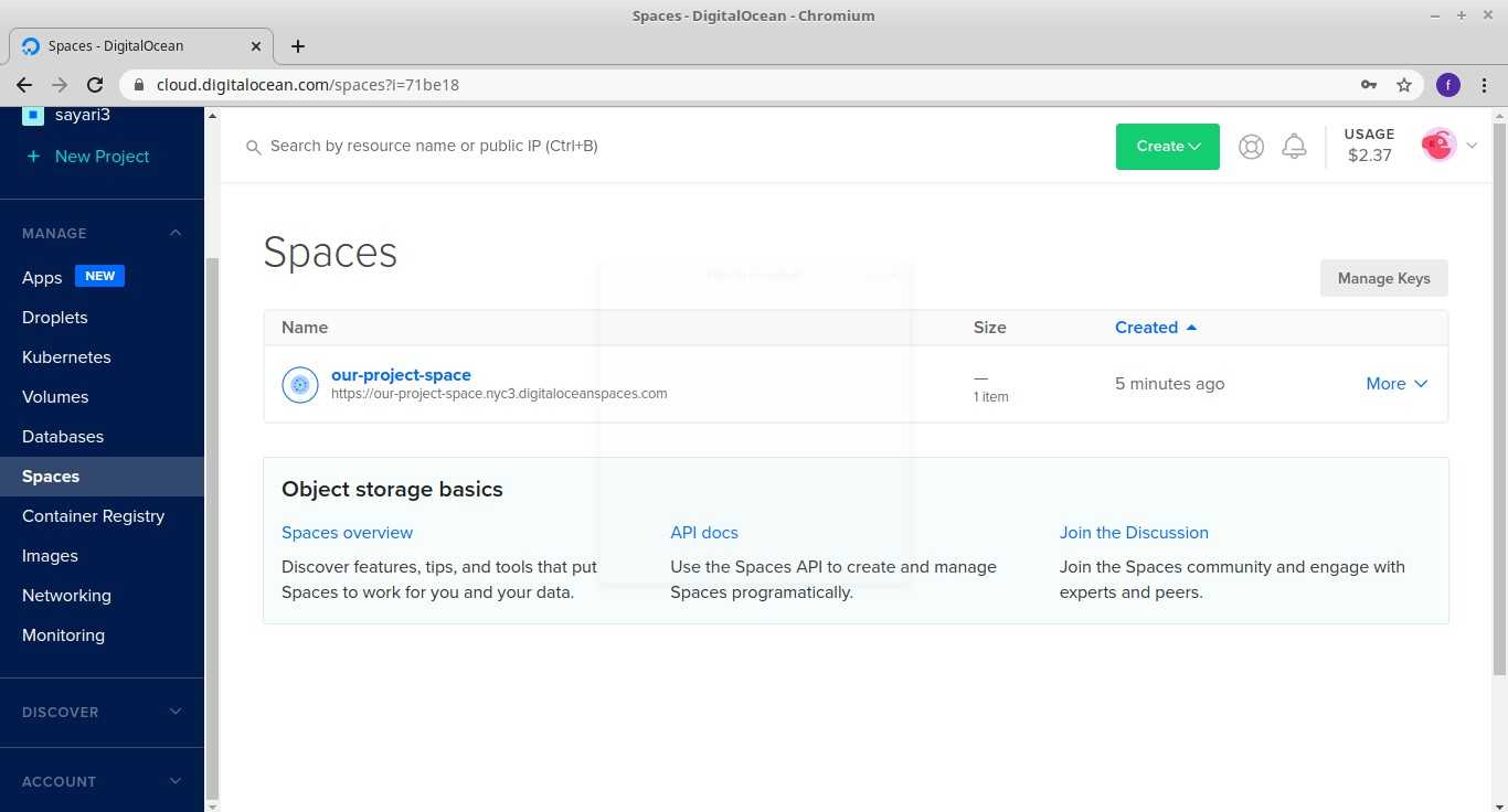 Next value is AWS_S3_ENDPOINT_URL, to get this value, you can click manage on your side bar , then spaces and then you will see a page like this