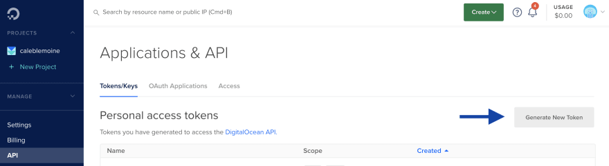 Now that you have your access key and secret for the spaces bucket, you’ll still need an API key to use with Terraform to create a few resources such as DigitalOcean droplets and a Spaces bucket. This can also be done in the «API» section of the console.