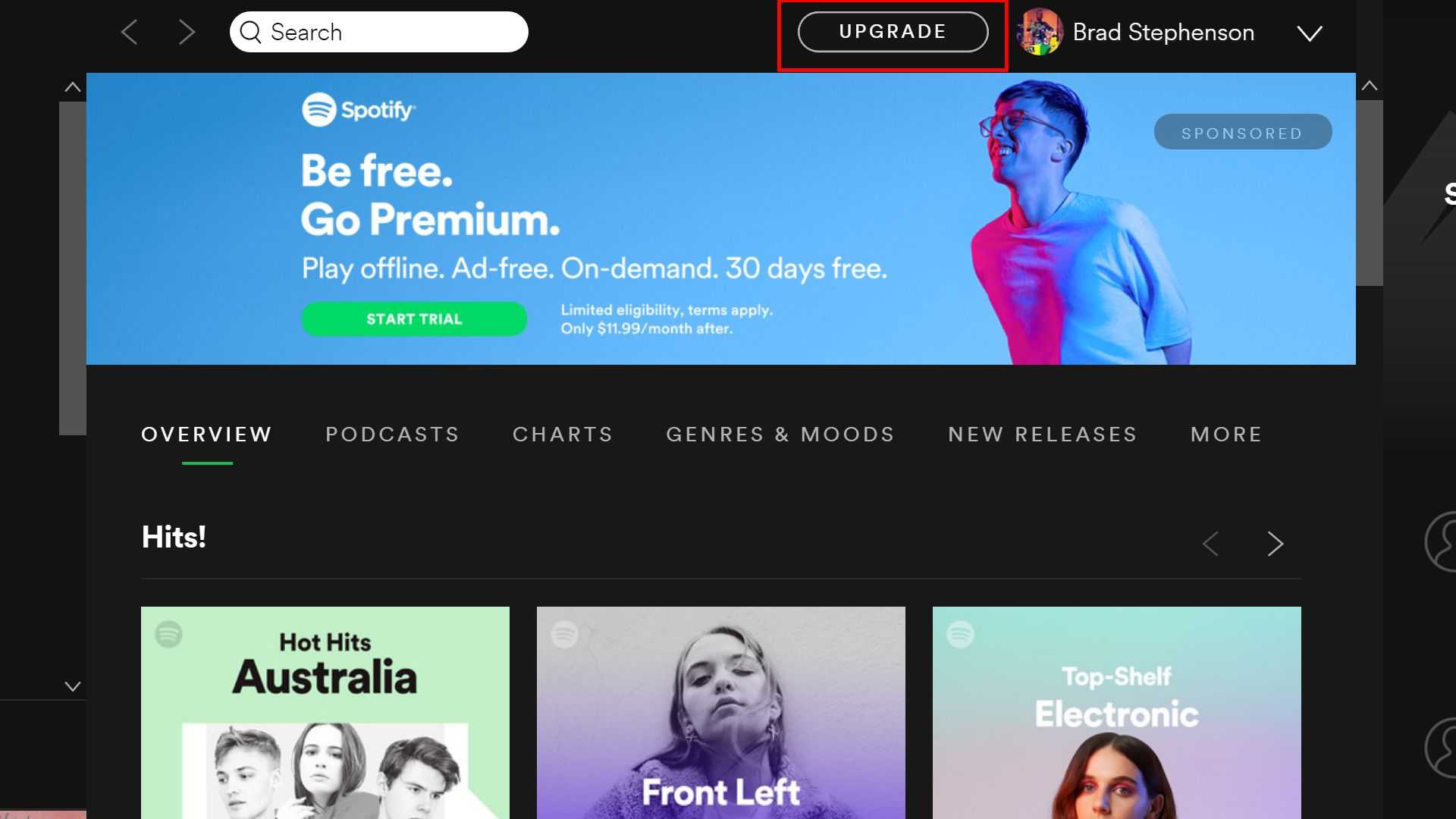Чтобы выполнить обновление до Spotify Premium из приложения Windows 10, выберите « Обновить» вверху экрана рядом с вашим именем. Вы откроете веб-страницу Spotify Premium в интернет-браузере Microsoft Edge на своем устройстве, которая содержит более подробную информацию об услуге Premium и имеет возможность подписаться на ежемесячную платную подписку.