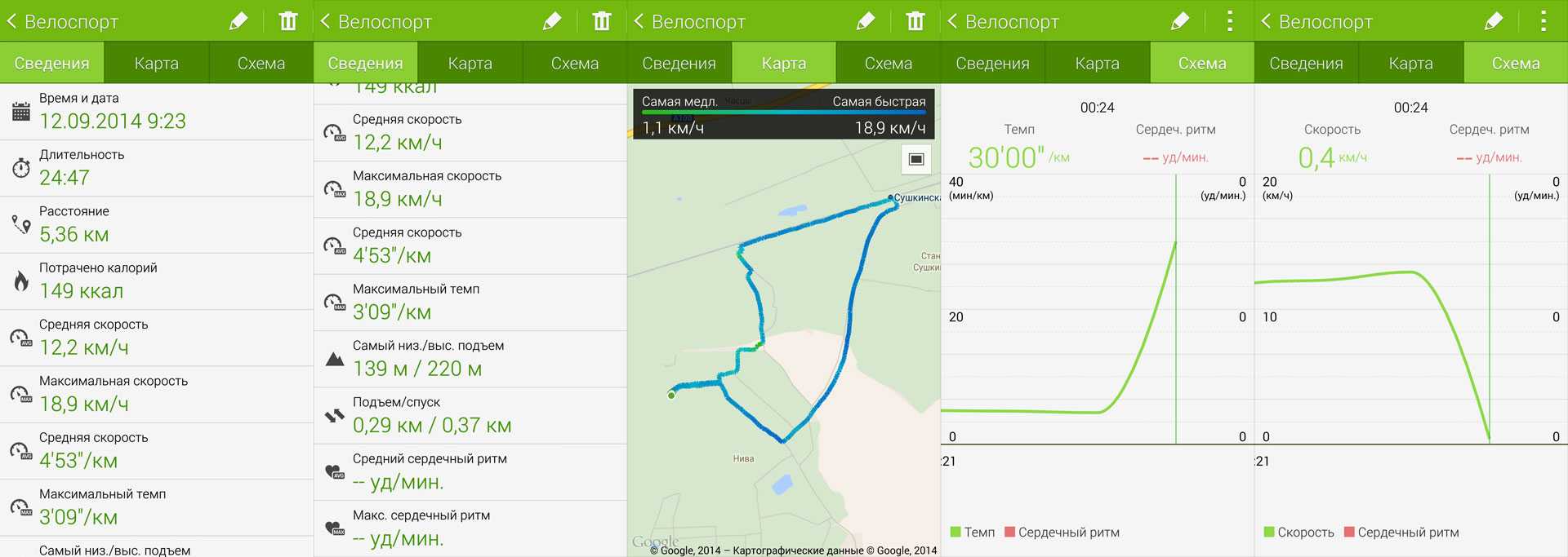 В режиме тренировки, задействуется не только шагомер, вернее, он совсем не задействуется, а продолжает считать шаги, как и раньше. А в ход идут показания встроенного датчика GPS, соответственно считаются подъемы и спуски, развиваемая скорость на отдельных участках, а также записывается маршрут тренировки. В чем разница между тренировкой с типом «ходьба» и «поход», я так и не разобрался (возможно, что в режиме «поход» GPS не так часто опрашивается, что экономит заряд батареи). Но, вот режимы «велоспорт» и «бег» стоит разобрать поподробнее.
