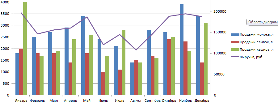 Получили гистограмму, размер поля которой можно менять. На такой диаграмме наглядно видно, например, что самые большие продажи были по молоку в ноябре, а самые маленькие – по сливкам в июне.