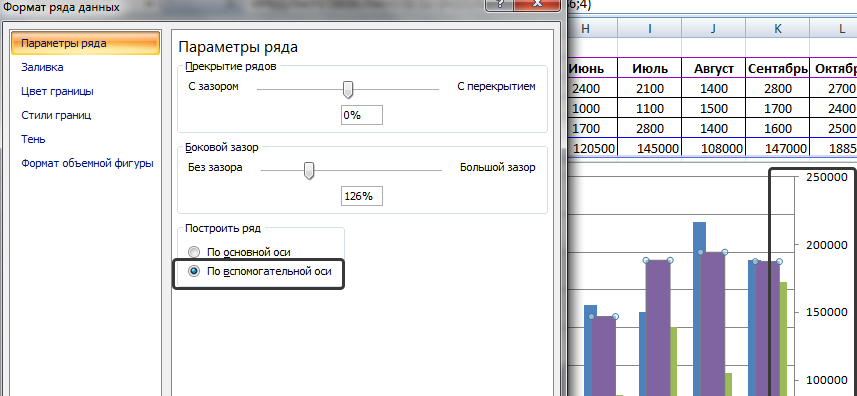 Вспомогательные оси — единственное решение ситуации, когда один или несколько рядов графика отображены как прямая линия. Это связано с тем, что их диапазон находится у края минимального заявленного на основной оси, поэтому и нужно добавить дополнительную.