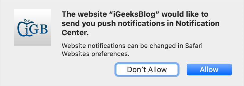 В push-уведомлениях с некоторых веб-сайтов отображаются кнопки «Разрешить» и «Нет, спасибо», а на некоторых сайтах отображаются кнопки «Разрешить» и «Заблокировать» или «Отменить». Вы можете разрешить, отменить или заблокировать уведомления с веб-сайта. Если вы разрешите, Safari покажет вам другое сообщение о том, что веб-сайт будет отправлять уведомления из «Центра уведомлений». Вы можете нажать «Разрешить», чтобы продолжить, или «Не разрешать», чтобы заблокировать.