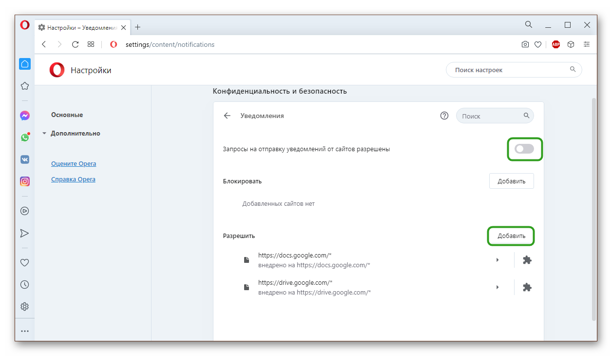 По аналогии со всплывающими рекламными окнами здесь можно добавить отдельные ресурсы в исключения, от которых вы бы хотели получать уведомления, то есть разблокировать всплывающие окна в Опере.