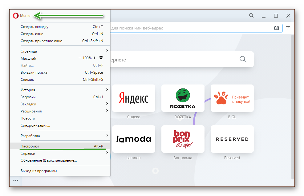- Откройте «Меню», кликнув на кнопку в виде буквы « О » в левом верхнем углу.