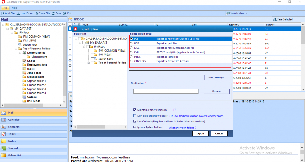 Несколько вариантов сохранения данных: Инструмент легко восстанавливает и сохраняет данные в форматах файлов PST, EML, MSG, PDF, HTML.
