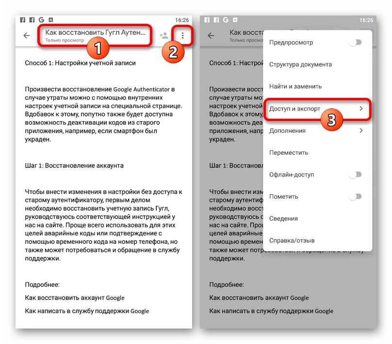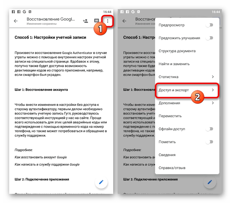 - В отличие от веб-сайта, мобильное приложение Google Документы предоставляет возможность повторного сохранения файлов в других форматах. Для того чтобы воспользоваться данной опцией, откройте главное меню «…» и выберите «Доступ и экспорт».