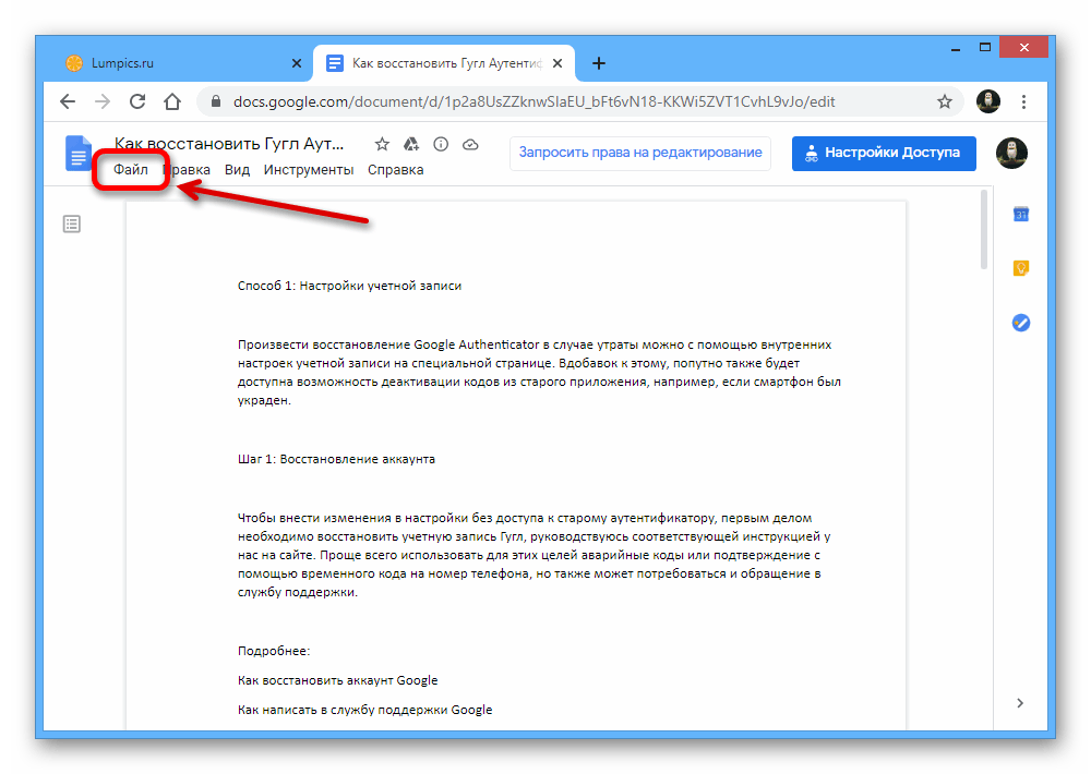 Безусловно, помимо автоматического сохранения файлы можно вручную добавлять на Google Диск, например, если вы хотите установить какие-то особые настройки вроде названия. Для этих целей в нужном документе разверните «Файл» на верхней панели.