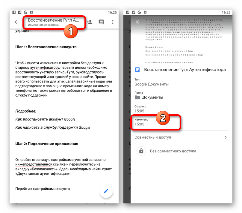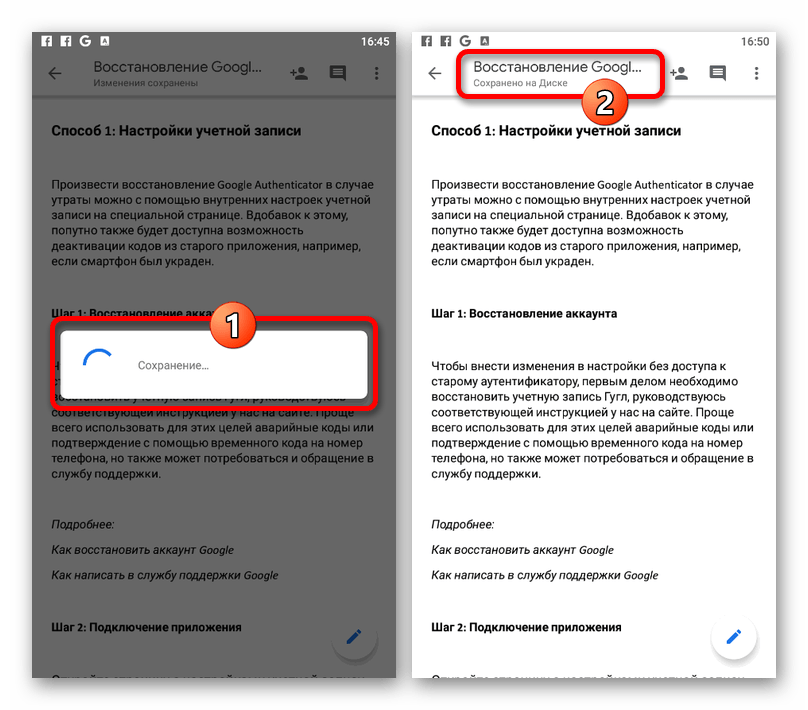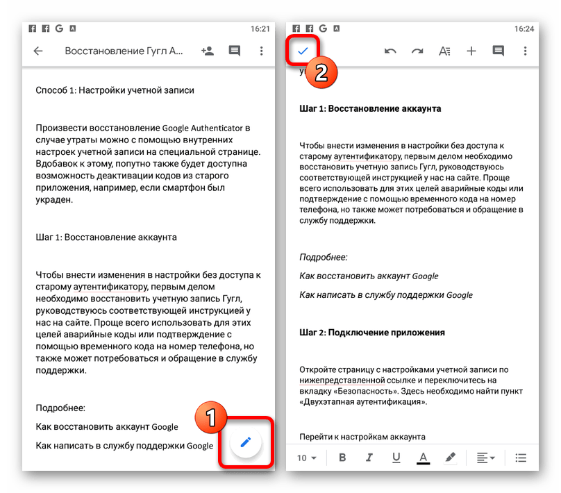 - Произвести сохранение файла в Google Docs через одноименное приложение можно вручную во время редактирования. Для этого после внесения изменений коснитесь значка с изображением галочки в левой части верхней панели.