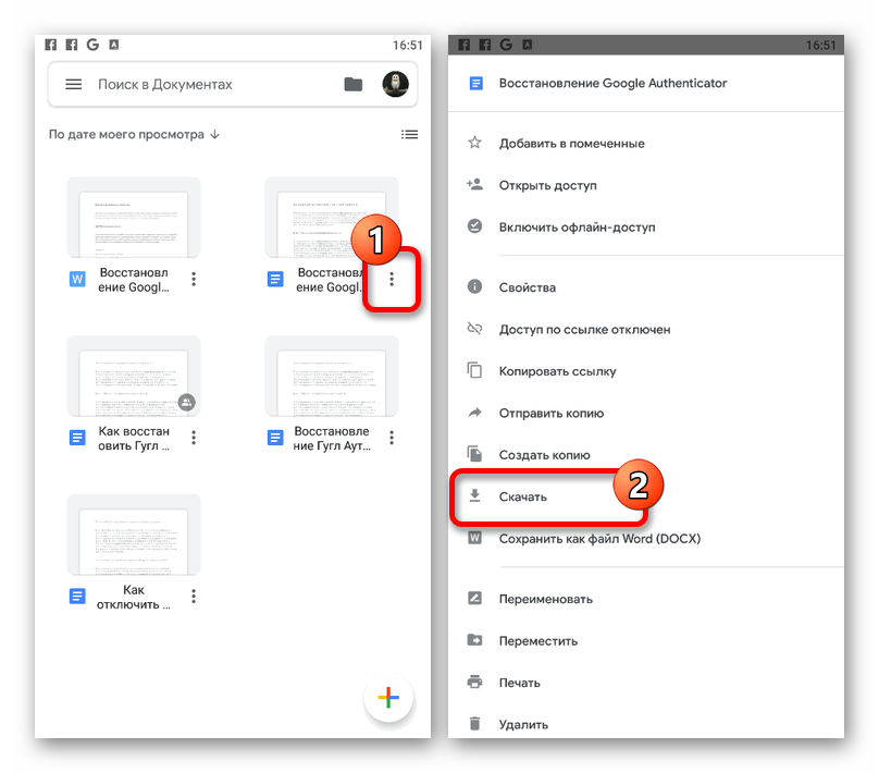 - Еще один вариант сохранения через Google Docs сводится к скачиванию документа в память используемого устройства. Для доступа к соответствующей возможности перейдите на главную страницу приложения, выберите один из представленных файлов, коснувшись значка «…» на нижней панели, и воспользуйтесь пунктом «Скачать».