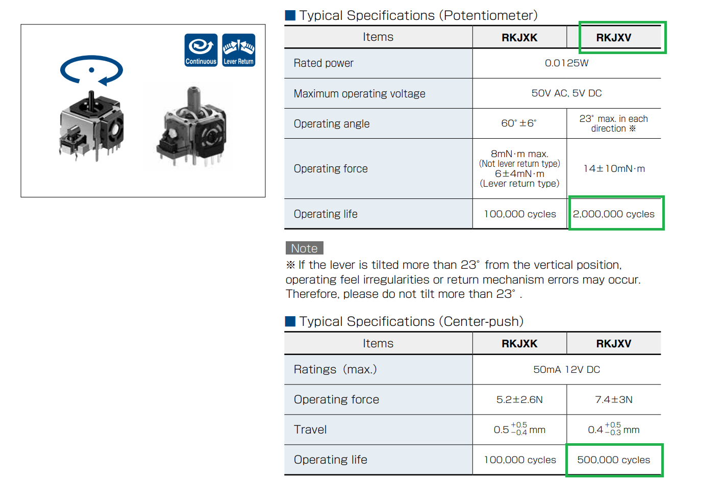 В соответствии с Японская компания Alps Electric, также известный как AlpsAline, создатель этих потенциометров в DualSense. Ожидаемый срок службы джойстика RKJXV делится на 100 000 циклов (вращение) и 500 000 циклов функции центрального нажатия.