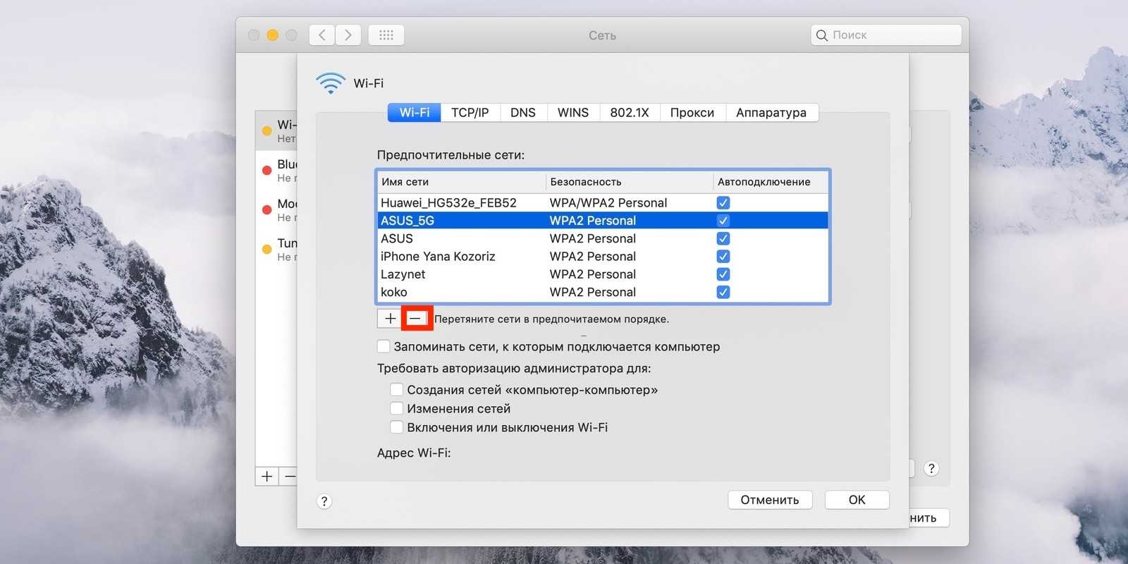 В этой ситуации требуется удалить уже имеющееся сетевое подключение в настройках сети, чтобы создать новое. Как и в предыдущем случае, необходимо попасть во вкладку «Сеть», найти нужный Wi-Fi и нажать на «—».