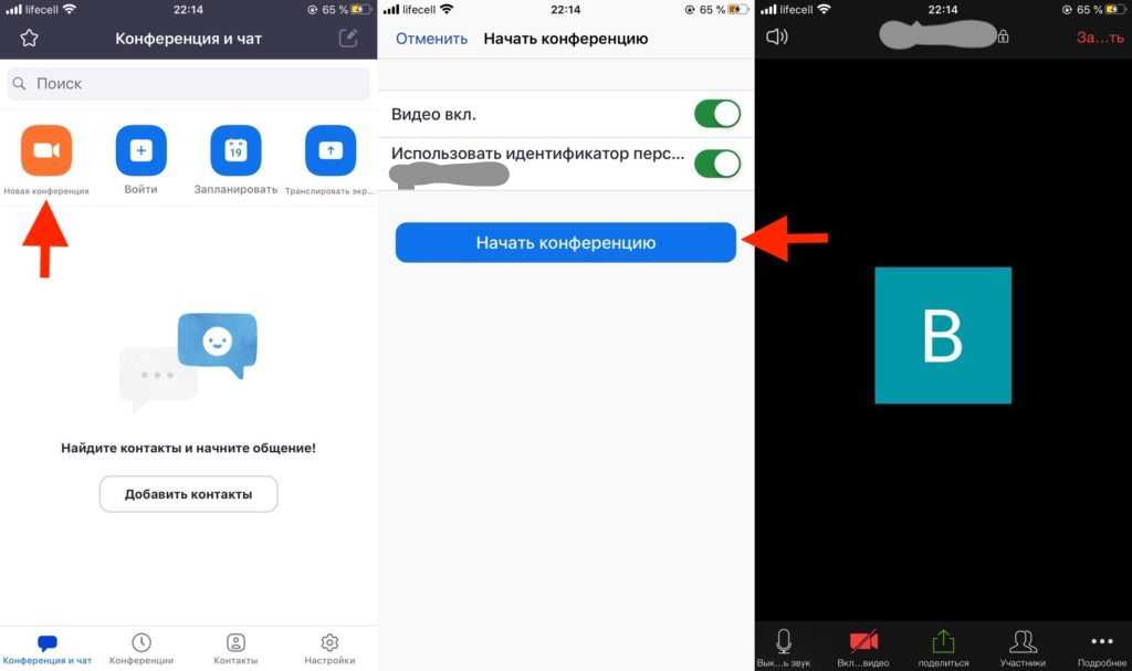 Смартфон. Открываем приложение, нажимаем Новая конференция — Начать конференцию.