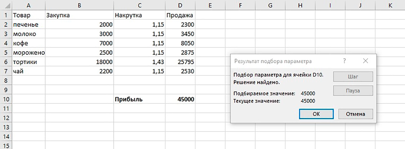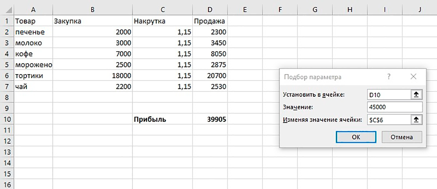 Для этого на вкладке «Данные» надо выбрать «Анализ „Что если“», с помощью функции «Подбор параметра» задать целевое значение и выбрать ячейку, которую нужно изменить для получения желаемой цифры.