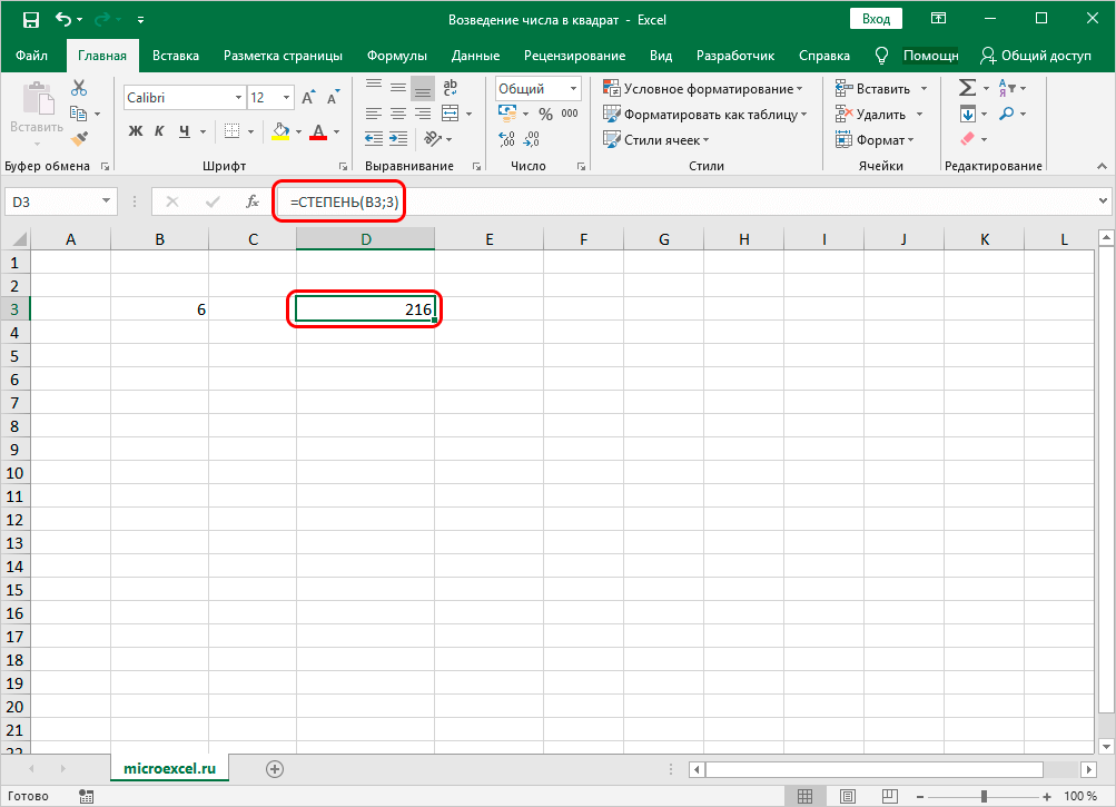 Примечание: Также, как и в случае использования формулы для расчета квадрата числа, функцию СТЕПЕНЬ можно применять для возведения числа в любую степень, указав в значении аргумента “Степень” нужную цифру. Например, чтобы возвести число в куб, пишем цифру 3.